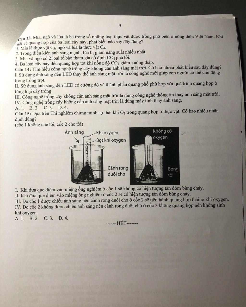 Câu 15: Đây là thí nghiệm về sự giải phóng khí oxi trong quá trình quang hợp.