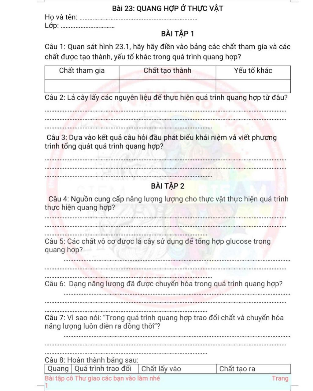 Câu 1: Quan sát hình 23.1, hãy hãy điền vào bảng các chất tham gia và các