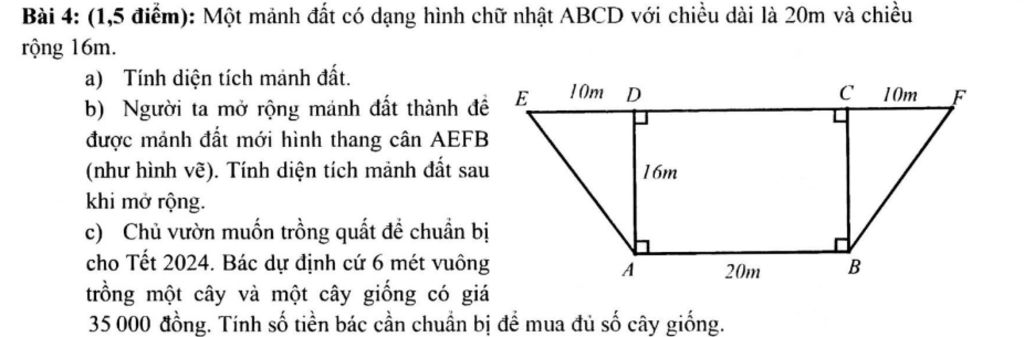 c) Chủ vườn muốn trồng quất để chuẩn bị cho Tết 2024. Bác dự định cứ 6 mét vuông trồng một cây và một cây giống có giÁ 35 000 đồng. Tính số tiền bác cần chuẩn bị để mua đủ số cây giống.