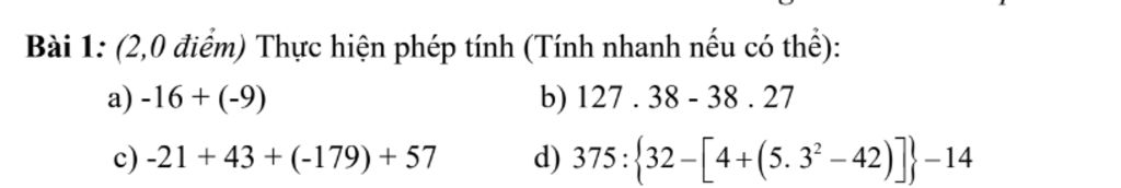Bài 1: (2,0 điểm) Thực hiện phép tính (Tính nhanh nếu có thể):