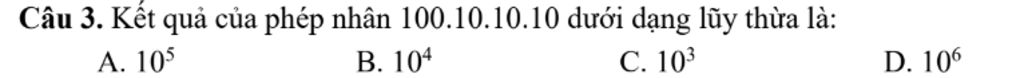 Câu 3. Kết quả của phép nhân 100.10.10.10 dưới dạng lũy thừa là: