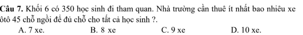 Câu 7. Khối 6 có 350 học sinh đi tham quan. Nhà trường cần thuê ít nhất bao nhiêu xe