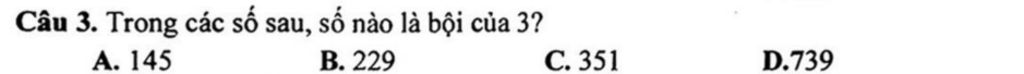 `A.` Loại vì `1 + 4 + 5 = 10` không chia hết cho `3`