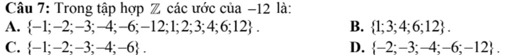 Hay `Ư(12)={-1;-2;-3;-4;-6;-12;1;2;3;4;6;12}`