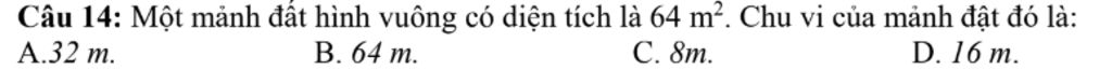 Câu 14: Một mảnh đất hình vuông có diện tích là 64 $m^{2}$ . Chu vi của mảnh đất đó là: