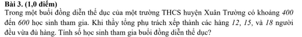 Bài 3. (1,0 điểm) Trong một buổi đồng diễn thể dục của một trường THCS huyện Xuân Trường có khoảng 400 đến 600 học sinh tham gia. Khi thầy tổng phụ trách xếp thành các hàng 12, 15, và 18 người đều vừa đủ hàng. Tính số học sinh tham gia buổi đồng diễn thể dục?