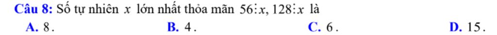 Vì `56 vdots x; 128 vdots x-> x in Ư CLN (56;128)`
