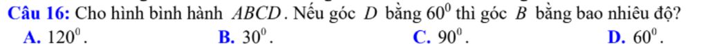 `=> hatD=hatB=60^@` (`2` góc đối bằng nhau)