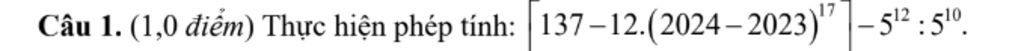 Câu 1. (1,0 điểm) Thực hiện phép tính: [137–12.$(2024–2023)^{17}$ ]- $5^{12}$ :$5^{10}$