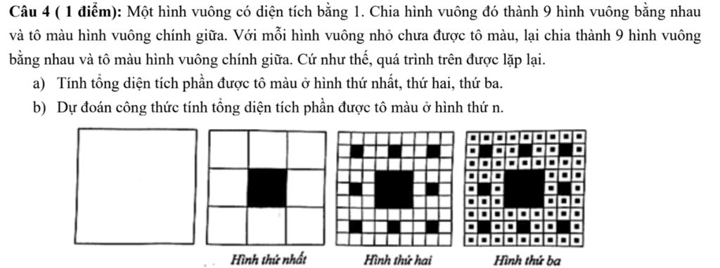 Câu 4 ( 1 điểm): Một hình vuông có diện tích bằng 1 . Chia hình vuông đó thành 9 hình vuông bằng nhau và tô màu hình vuông chính giữa. Với mỗi hình vuông nhỏ chưa được tô màu, lại chia thành 9 hình vuông bằng nhau và tô màu hình vuông chính giữa. Cứ như thế, quá trình trên được lặp lại.