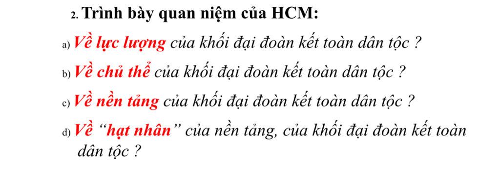 a, Lực lượng của khối đại đoàn kết toàn dân tộc theo quan niệm của chủ tịch Hồ Chí Minh bao gồm tất cả các tầng lớp nhân dân, không phân biệt dân tộc, tôn giáo, giai cấp & độ tuổi. Tất cả đều có thể tham gia vào cuộc đấu tranh vì sự nghiệp cách mạng chung.