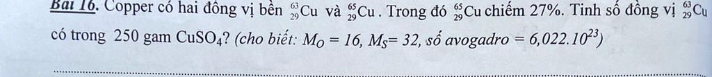 `73\% . (250)/(63,54 + 32 + 16.4) .6,022.10^{23} ~~ 6,889.10^{23}` (nguyên tử)