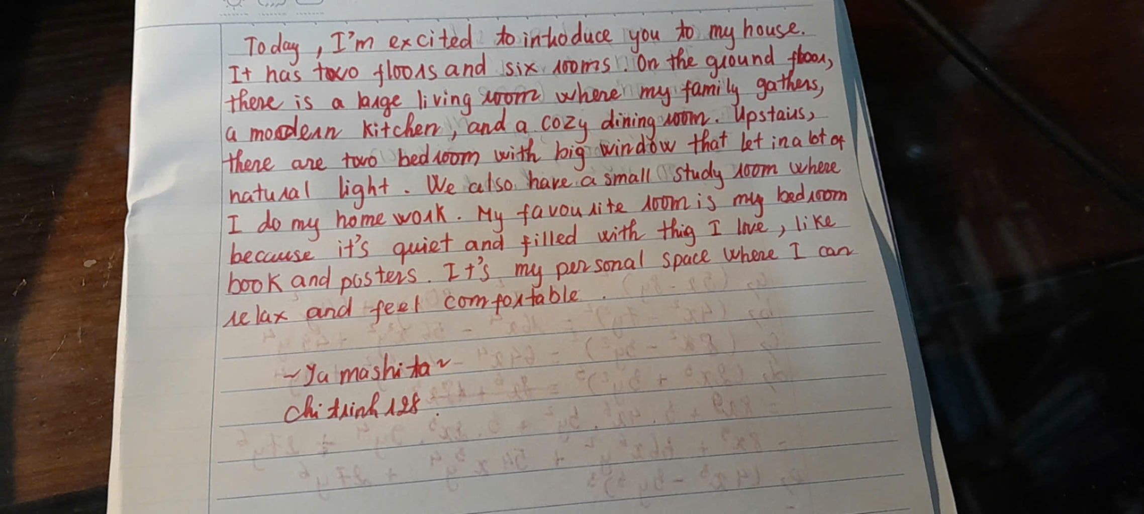 `=>` Today, I will introduce you to my house. My house has two floors and three rooms: a living room, a kitchen, and a bedroom. The living room is bright and comfortable, the kitchen is modern, and my bedroom is cozy with my favorite decorations. My favorite room is my bedroom because it is my personal space where I can relax and have fun.