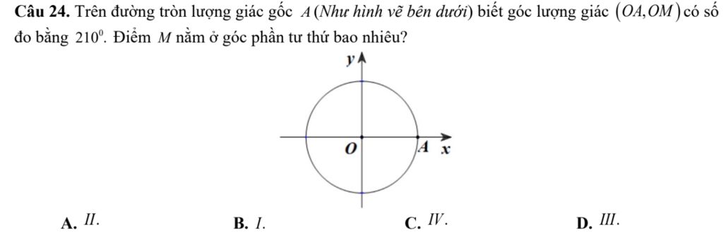 Câu 24. Trên đường tròn lượng giác gốc A ( Như hình vẽ bên dưới) biết góc lượng giác (OA,OM) có số đo bằng `210^∘`. Điểm M nằm ở góc phần tư thứ bao nhiêu?