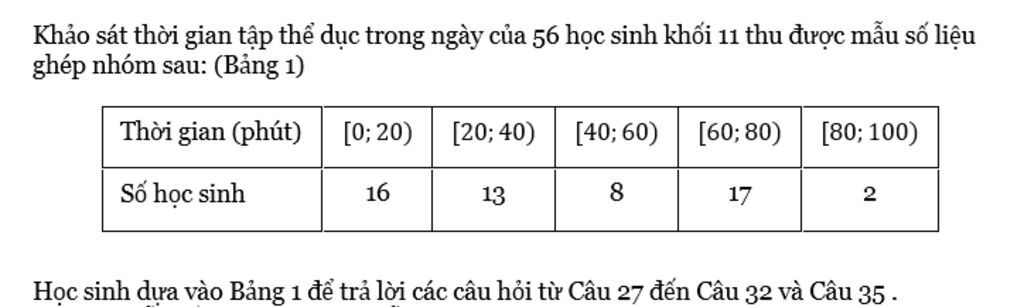 Khảo sát thời gian tập thể dục trong ngày của 56 học sinh khối 11 thu được mẫu số liệu
