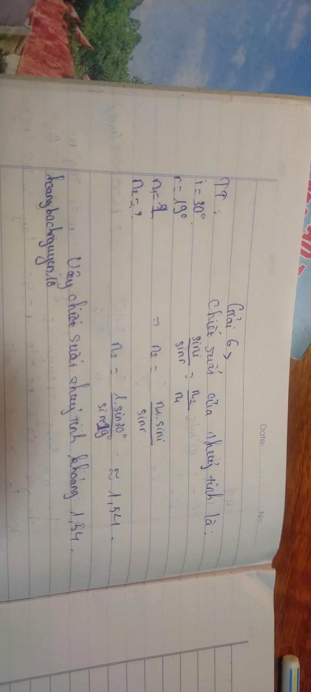 `(sini)/(sinr)=(n_2)/(n_1)<=> (sin30^o)/(sin19^o)=(n_2)/1 `