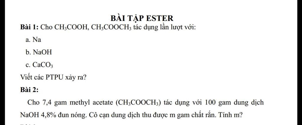 Bài 1: Cho CH3COOH, CH3COOCH3 tác dụng lần lượt với: