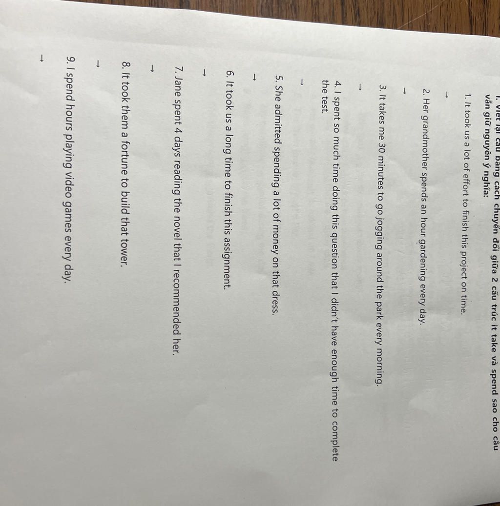 Đề bài:Viết lại câu bằng cách chuyển đổi giữa 2 cấu trúc it take và spend sao cho hai câu vẫn giữ nguyên nghĩa