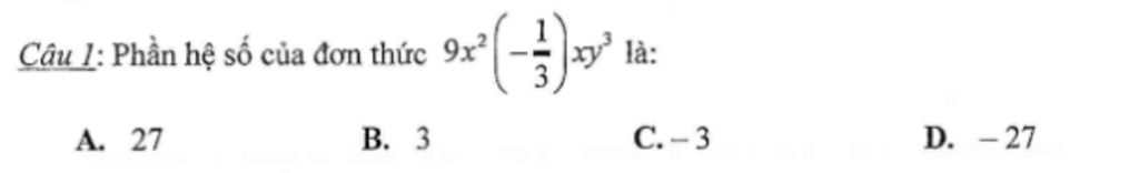 Câu 1: Phần hệ số của đơn thức `9x^2 (-1/3)xy^3 `là: