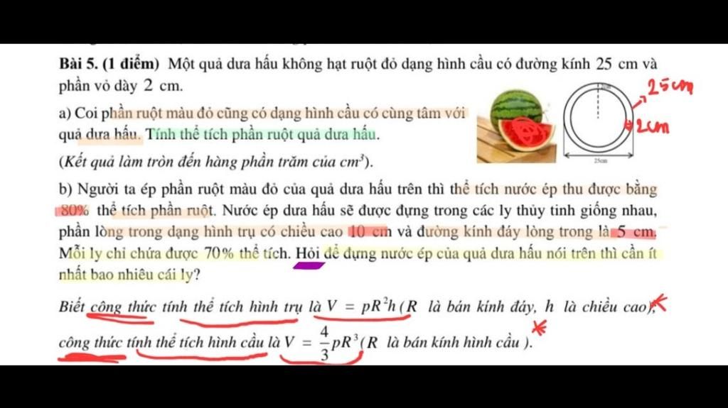 Bài 5. (1 điểm) Một quả dưa hấu không hạt ruột đỏ dạng hình cầu có đường kính 25 cm và