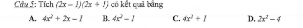 Câu 5: Tích `(2x-1)(2x+1)` có kết quả bằng
