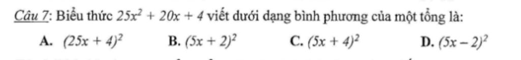 Câu 7: Biểu thức `25x^2+20x+4` viết dưới dạng bình phương của một tổng là: