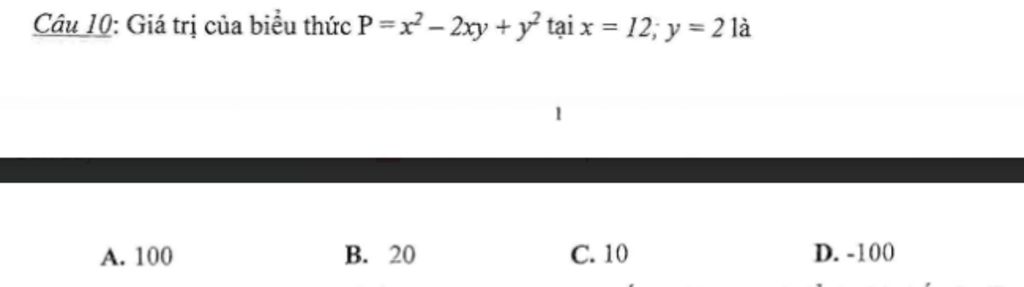 Câu 10: Giá trị của biểu thức `P=x^2-2xy+y^2 tại x=12;y=2 `là