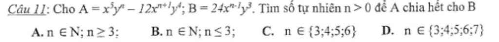 Câu 11: Cho `A=x^5 y^n-12x^(n+1) y^4;B=24x^(n-1) y^3`. Tìm số tự nhiên n>0 để A chia hết cho B