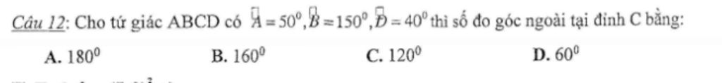 Câu 12: Cho tứ giác ABCD có `A=50^∘`,`B=150^0`,`D =40^0` thi số đo góc ngoài tại đỉnh C bằng: