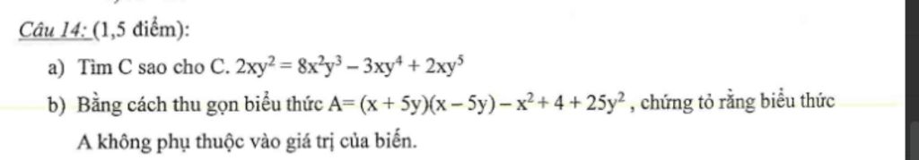 b) Bằng cách thu gọn biểu thức `A=(x+5y)(x-5y)-x^2+4+25y^2`, chứng tỏ rẳng biểu thức A không phụ thuộc vào giá trị của biến.