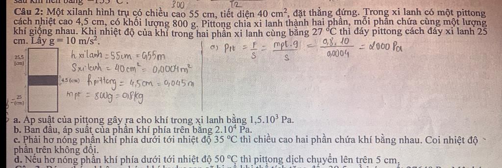 \dfrac{{{p_1}'}}{{{T_1}}} = \dfrac{{{p_2}'}}{{{T_2}}} \Rightarrow \dfrac{{\dfrac{{102}}{{101}}{{.10}^5}}}{{27 + 273}} = \dfrac{{\dfrac{{102}}{{101}}{{.10}^5} + 2000}}{{{T_2}}}\\