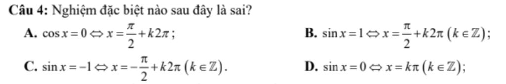 `D.` `sinx = 0<=> sinx = sin\pi <=> x = k\pi` ` ( kinZZ)`