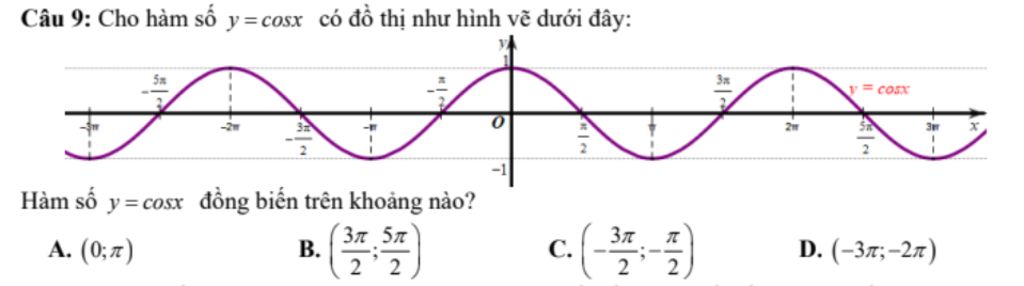 Câu 9: Cho hàm số y=cosx có đồ thị như hình vẽ dưới đây: