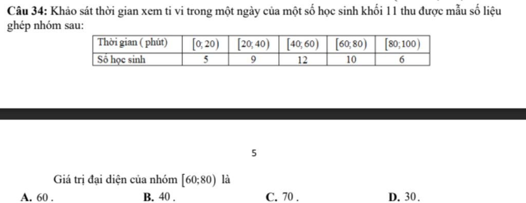 Câu 34: Khảo sát thời gian xem ti vi trong một ngày của một số học sinh khối 11 thu được mẫu số liệu