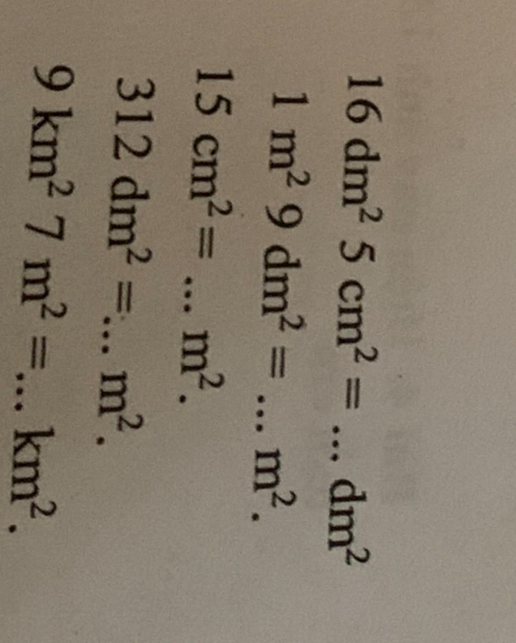 ` -> 16dm^2 5cm^2 = 16 + 0,05 = 16,05dm^2 `