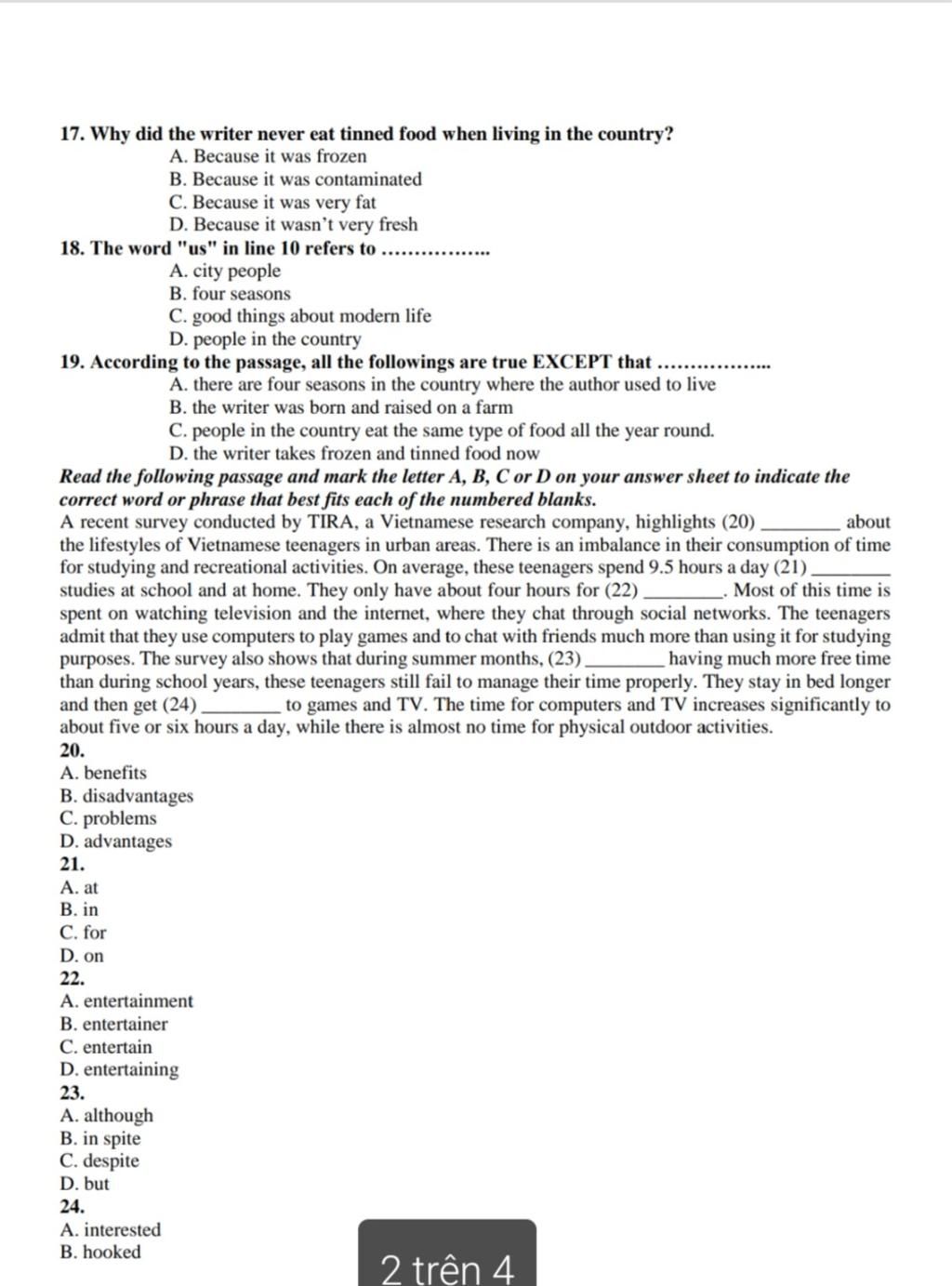 Câu 24: "hooked" đi với giới từ "on", còn "interested" đi với giới từ "in" ( đều