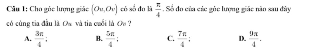 Câu 1: Cho góc lượng giác (Ou,Ov) có số đo là `π/4`. Số đo của các góc lượng giác nào sau đây có cùng tia đầu là Ou và tia cuối là Ov ?