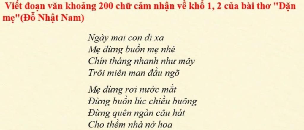 Khổ 1 và 2 của bài thơ "Dặn mẹ" chứa đựng những lời dặn dò nhẹ nhàng, đầy yêu thương của một người con trước khi rời xa vòng tay mẹ. Câu thơ "Ngày mai con đi xa, mẹ đừng buồn mẹ nhé" mở đầu bằng sự an ủi, khích lệ, như lời con muốn mẹ yên lòng dù con không còn ở bên. Thời gian "chín tháng nhanh như mây" trôi qua miên man, mang ý nghĩa rằng sự chia xa là tất yếu, tự nhiên, không thể tránh khỏi. Tuy nhiên, người con không muốn mẹ đau buồn, không muốn nhìn thấy những giọt nước mắt, mà mong mẹ giữ tinh thần lạc quan, vững vàng trong những ngày tháng sắp tới. "Đừng quên ngàn câu hát, cho thềm nhà nở hoa" là lời nhắn gửi mẹ hãy giữ niềm vui, nuôi dưỡng những điều đẹp đẽ trong cuộc sống, để ngôi nhà luôn rộn ràng, tươi vui dù thiếu vắng con. Những câu thơ gợi lên tình cảm sâu sắc, tràn đầy sự hiếu thảo và lòng biết ơn của người con, đồng thời thể hiện sự thấu hiểu và mong muốn bảo vệ mẹ khỏi nỗi buồn khi con đi xa.