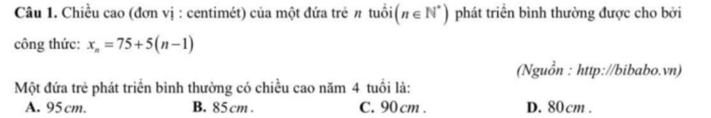 Câu 1. Chiều cao (đơn vị : centimét) của một đứa trẻ n tuổi (n∈N* ) phát triển bình thường được cho bởi công thức: `x_n`=75+5(n-1)