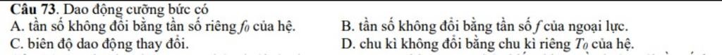 `to` Trong dao động cưỡng bức, tần số của dao động cưỡng bức bằng tần số của ngoại lực tác dụng lên hệ, không phụ thuộc vào tần số riêng của hệ.