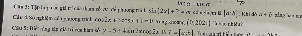 Câu 3: Tập hợp các giá trị của tham số m để phương trình sin(2x)+2 = m có nghiệm là [a;b]. Khi đó a+b bằng bao nh