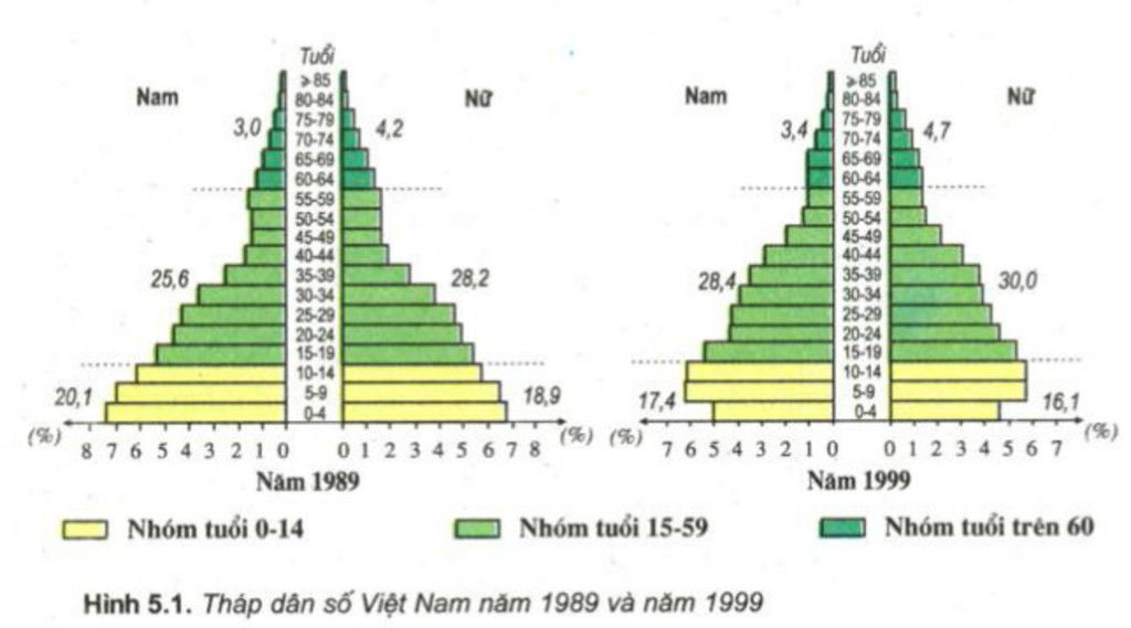 - Giống nhau: Cả hai tháp dân số đều có tỉ lệ dân số phụ thuộc lớn (ở tháp dân số năm 1989 là 46,2%, ở tháp dân số năm 1999 là 41,6%).