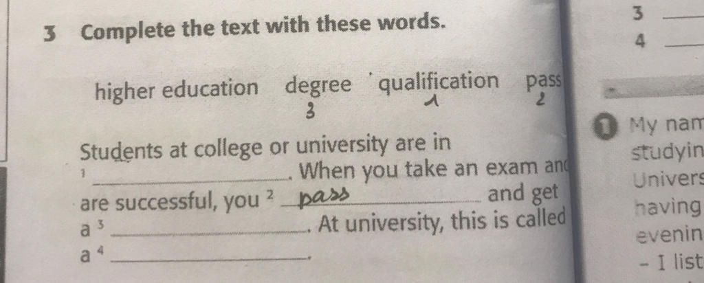 Sinh viên cao đẳng hay đại học tham gia việc học ở bậc cao hơn. Khi bạn làm bài thi và thành công hoàn thành, bạn qua môn và nhận được một văn bằng. Ở đại học, thứ này được gọi là bằng cấp.
