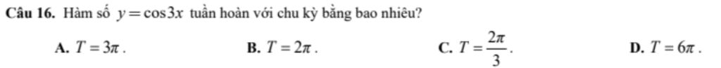 Hàm số `y = Cos3x` tuần hoàn với chu kỳ `T = (2π)/(|a|) = (2π)/3`