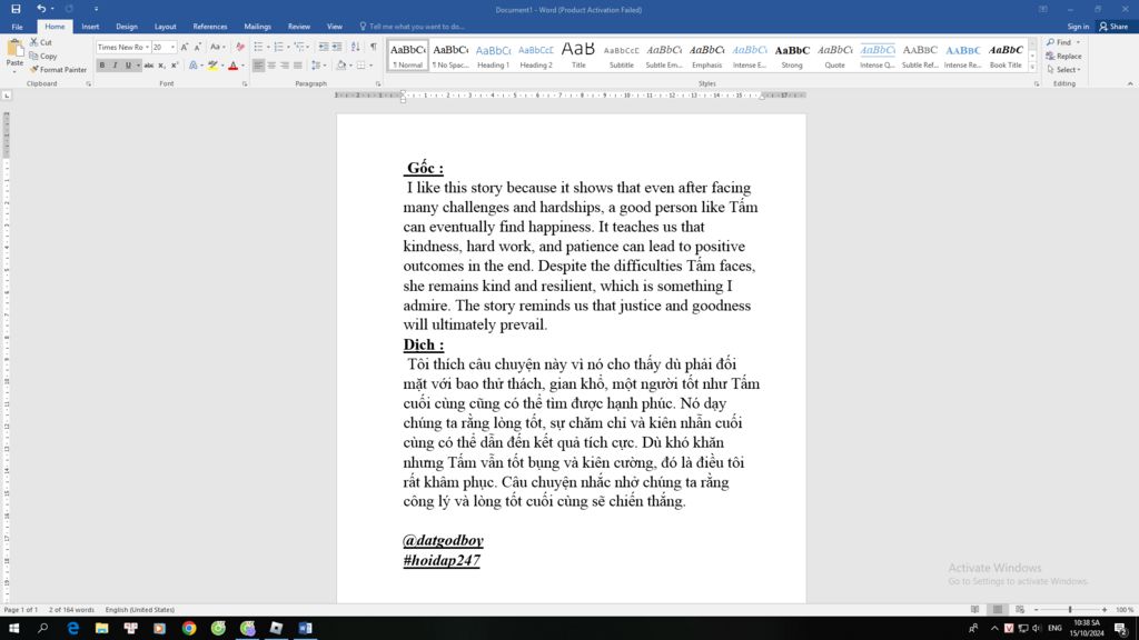 One of my favorite stories is from Vietnam. It's about two sisters, Tấm and Cám. The two sisters are very different. Tấm works hard every day helping to cook and clean the house. She always thinks about other people and tries to help her family. Cám is very different to Tấm. She never does any chores and she doesn't share anything. Cám does lots of bad things to Tấm. It's not a nice story, but in the end, Tấm's life is very good. I like this story because after such a hard life she is happy.