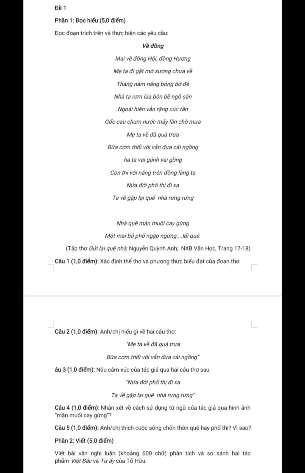 Câu 1 (1,0 điểm): Xác định thể thơ và phương thức biểu đạt của đoạn thơ