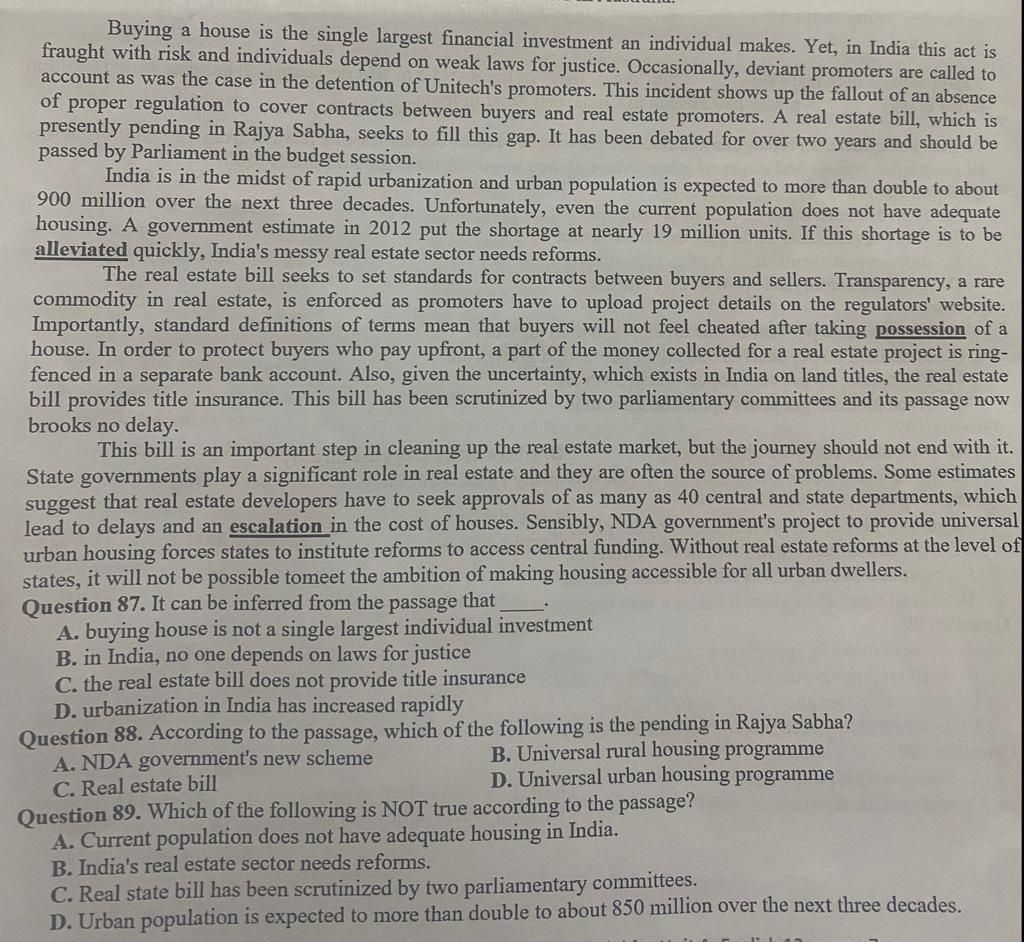 `-` Dữ kiện : A real estate bill, which is presently pending in Rajya Sabha, seeks to fill this gap.