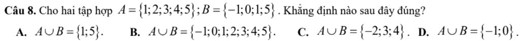 Câu 8. Cho hai tập hợp A={1;2;3;4;5}; B={-1;0;1;5}. Khẳng định nào sau đây đúng?