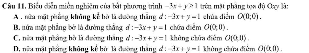 Câu 11. Biểu diễn miền nghiệm của bất phương trình −3x+y≥1 trên mặt phẳng tọa độ Oxy là: