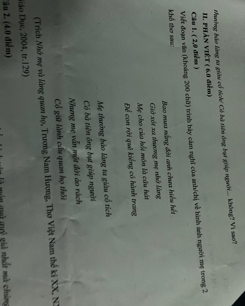 Hình ảnh người mẹ trong hai khổ thơ của Trương Nam Hương hiện lên thật mộc mạc, thân thương nhưng cũng vô cùng cao cả. Mẹ không chỉ là người sinh thành, nuôi dưỡng mà còn là người truyền lại cả hồn quê, bản sắc quê hương cho con như một món “của hồi môn” vô giá. Trong từng câu hát dân ca, trong lời ru ngọt ngào hay điệu quan họ tha thiết, mẹ đã âm thầm đặt vào đó tình yêu thương và niềm tự hào về cội nguồn. Dù cuộc đời mẹ “một đời áo rách”, chịu bao vất vả, hy sinh, mẹ vẫn “cố giữ lành câu quan họ thôi” như thể giữ gìn phần hồn thiêng liêng nhất của làng quê Bắc Bộ để truyền lại cho con làm hành trang bước vào đời. Mẹ hiện lên như một biểu tượng của sự kiên cường, giàu đức hi sinh, lặng lẽ mà bền bỉ. Đọc hai khổ thơ, ta không chỉ xúc động trước tình mẹ bao la mà còn thấy được trách nhiệm của người làm con: phải biết trân trọng và gìn giữ những giá trị văn hóa truyền thống mà mẹ đã nâng niu suốt cả cuộc đời.